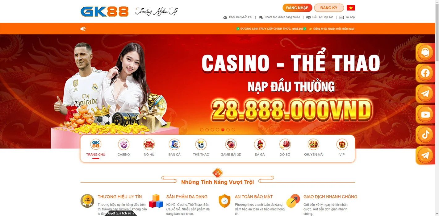 - Đa dạng sản phẩm cá cược: GK88 cung cấp một loạt các sản phẩm cá cược, từ cá cược thể thao, casino trực tuyến, đến các trò chơi như poker, bắn cá, slot và xổ số. Điều này giúp đáp ứng nhu cầu đa dạng của người chơi, từ những người yêu thích thể thao đến những người thích trải nghiệm không khí sòng bạc.