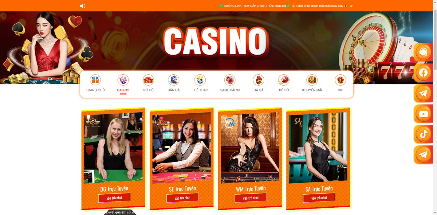 Người chơi có thể trải nghiệm không khí sòng bạc thực tế với các trò chơi casino trực tuyến được phát trực tiếp với người chia bài thật. GK88 hợp tác với các nhà cung cấp phần mềm hàng đầu như Evolution Gaming, Microgaming để đảm bảo chất lượng hình ảnh và âm thanh tốt nhất.