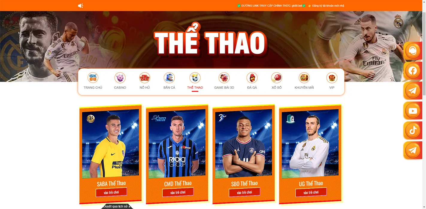 GK88 cung cấp đa dạng các môn thể thao để cá cược, từ những môn phổ biến như bóng đá, bóng rổ, tennis đến các môn thể thao ít phổ biến hơn như crikét, darts, và các môn thể thao điện tử. Tỷ lệ cược cạnh tranh và cập nhật liên tục, đảm bảo người chơi luôn có cơ hội tốt nhất.