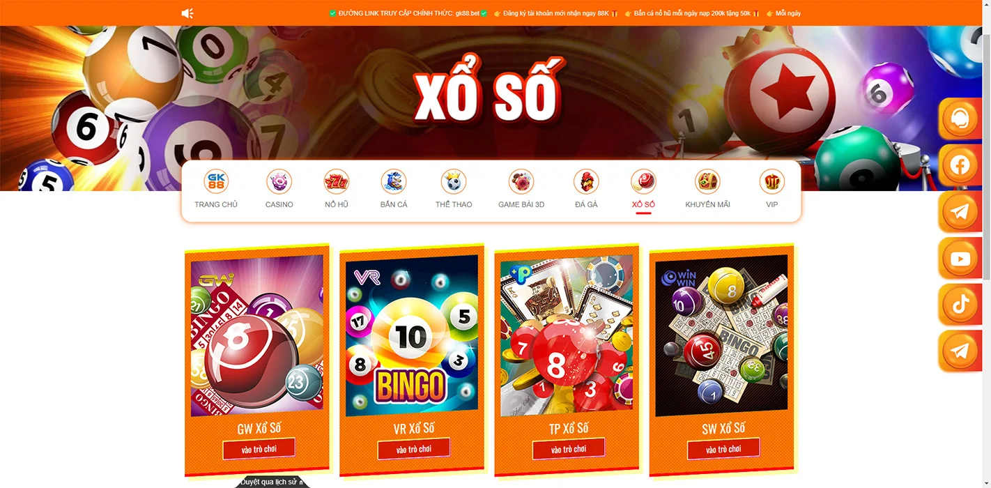 Ngoài ra, GK88 còn cung cấp các trò chơi xổ số nhanh như Keno, cho phép người chơi tham gia nhiều lần trong ngày với kết quả được công bố ngay lập tức.